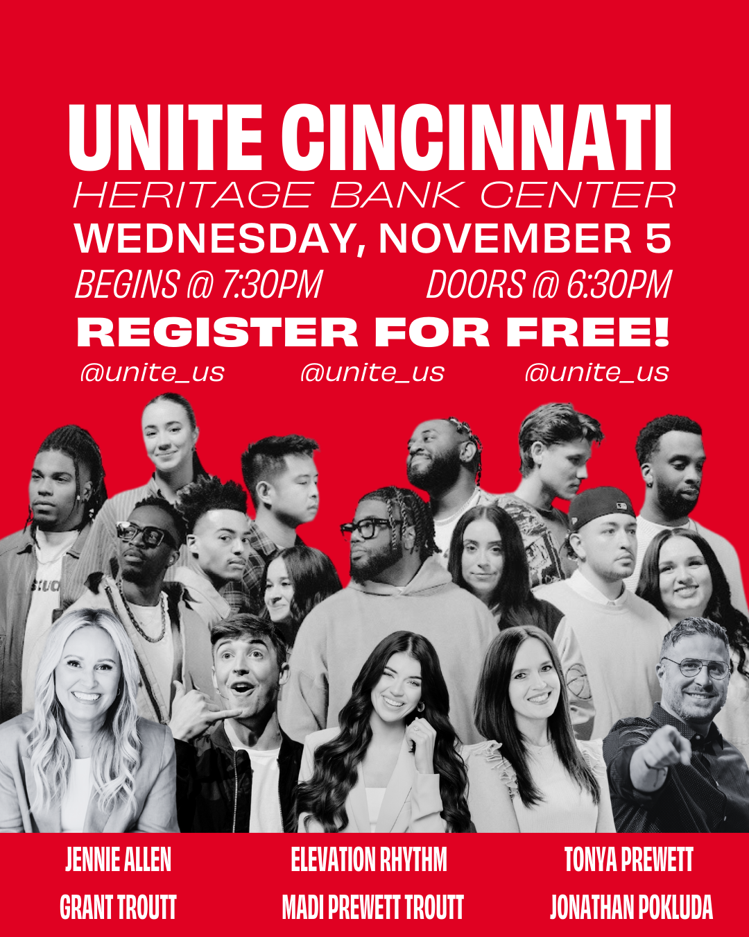 Join us for Unite Cincinnati on November 5 at 7:30 pm at Heritage Bank Center in Cincinnati, OH for a night of worship and powerful messages! Come see us at the Ignite Booth! We have a gift for you!